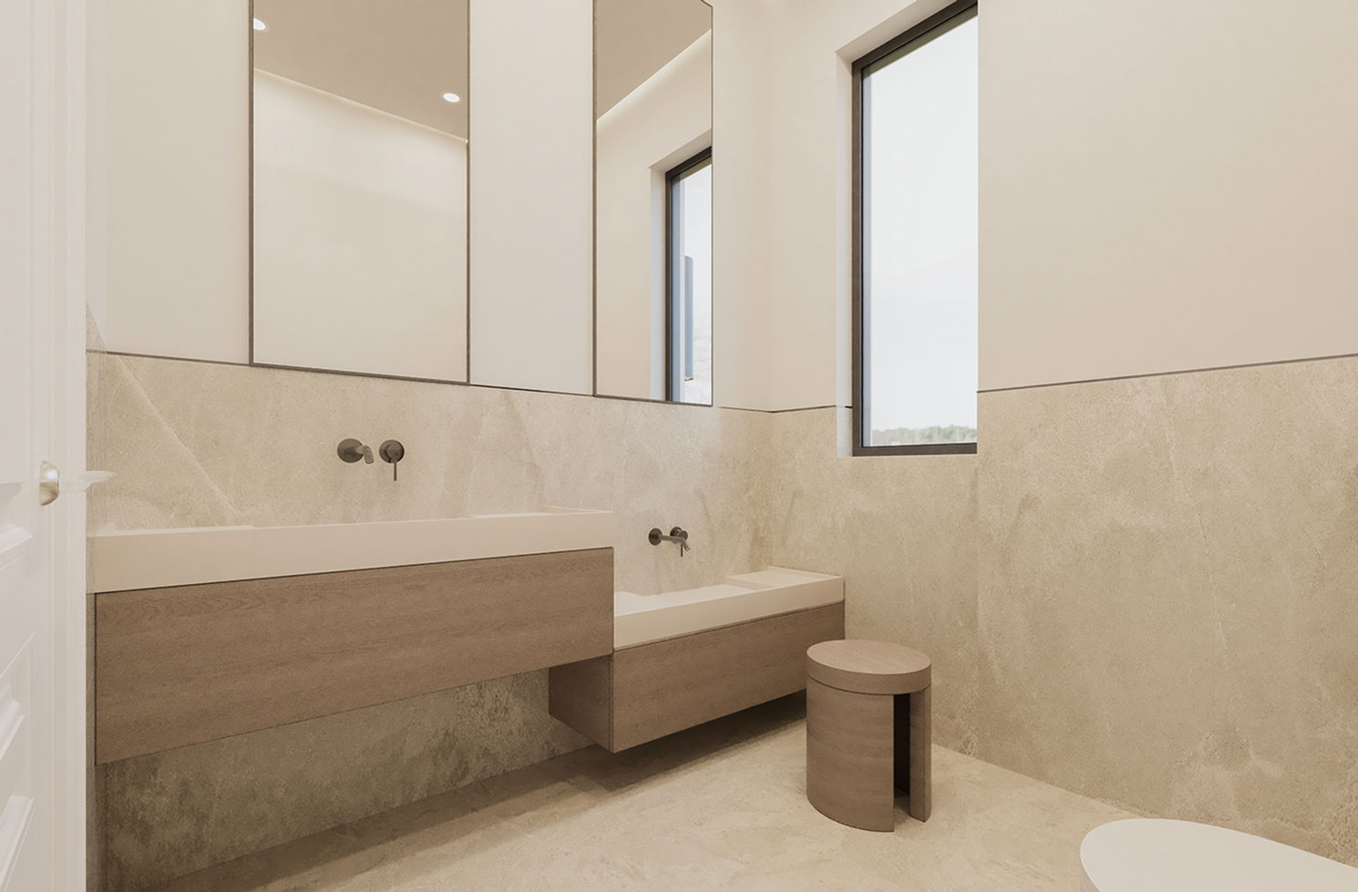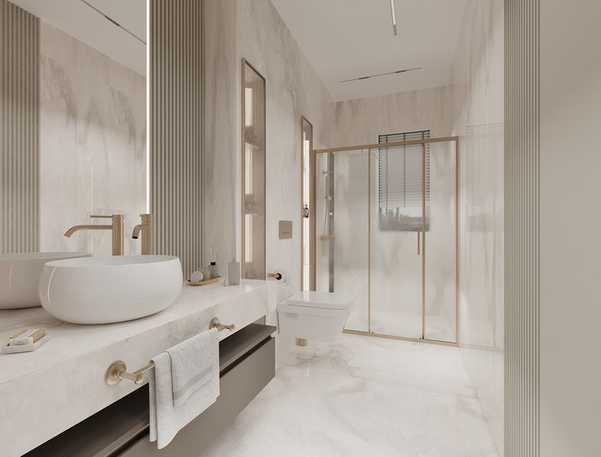 İç mekânlarda gün ışığıyla şekillenen bir dolaşım tasarımı benimsendi. Yaşam alanları, hacimsel geçişlerle birbirine bağlanırken mahremiyet gerektiren odalar kontrollü biçimde ayrıştırıldı. Mekânda kullanılan malzeme dili ve renk paleti, zamansızlık ve konfor hissini öne çıkarırken; F.G.A. Villa, estetik ve fonksiyon arasında kurduğu dengeli ilişkiyle nitelikli konut mimarisine örnek teşkil eder.