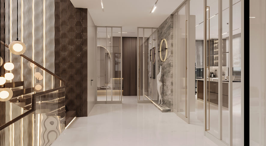 F.M. Villas’ta iç mekânlar, yaşamı destekleyen akışkanlık ve yalınlık ilkesiyle planlandı. Her oda, gün ışığıyla kurduğu ilişki sayesinde farklı saatlerde farklı atmosferler sunar. Fonksiyonel yerleşim planı, hem bireysel alanlara saygı gösteriyor hem de sosyal yaşamı destekleyen açıklıklar yaratıyor. Malzeme ve mobilya tercihleri ise sıcak, huzurlu ve rafine bir iç yaşamı mümkün kılıyor.